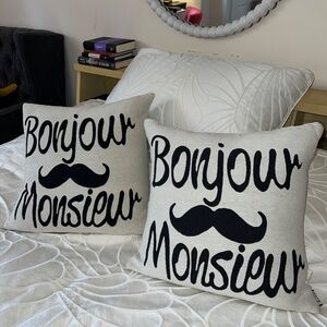 Set of 2 down filled decorative pillows . Black and canvas tone . With “bonjour monsieur” aka hello mister on the front and back of the pillows .