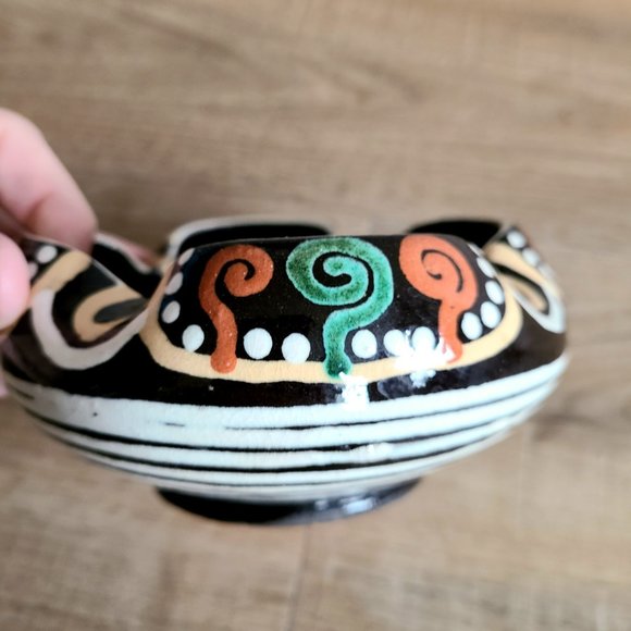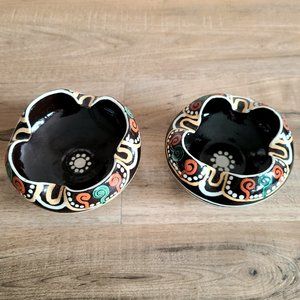Set of 2 hand made hand painted ceramic ashtrays with bright multicolor design. 5'' x 2 1/4'' and 4 3/4'' x 2 1/4''. Glazed inside. Great condition.