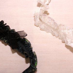 Free with any $15 purchase! Set of two lace chokers, one blank and one white. Both features elastic center, iridescent edges, and off-center bow. Lobster claw closure. Never worn. Choker in 14" long un-stretched and 24" stretched. Extension chain is 2" long. Comes from a smoke-free home that has cats and dogs. Tags: punk, goth, y2k, alternative, lolita