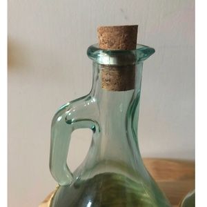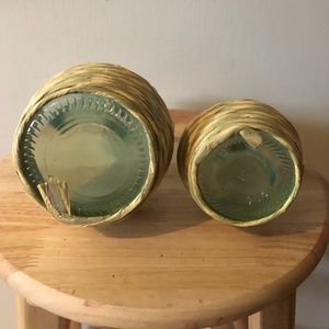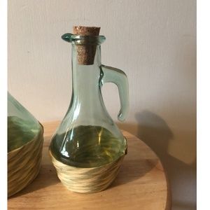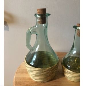 Set of two vintage rustic bottles with cork stopper and wicker accent at base new. Never used, strong rustic cottagecore cabin vibe. Could be used for oil and vinegar. Please see pictures for dimensions. This item comes from a smoke free, pets friendly home. Recycled bags/box used when possible. Please, let me know if you'd like any additional info. Thanks for looking!