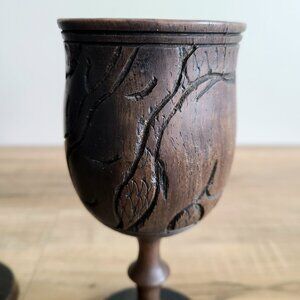 Set of 2 vintage wooden wine goblets with carved African wild animals design.