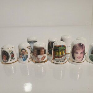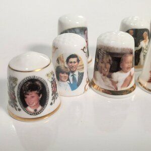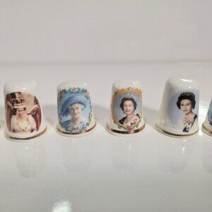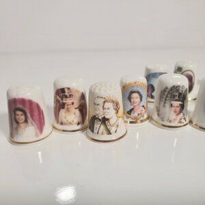 Beautiful collection of 20 vintage-style royal family porcelain thimbles, each featuring detailed images of notable members of the British Royal Family. About half of the set highlights Queen Elizabeth II throughout the years, with the remaining pieces showcasing Princess Diana and other royals.