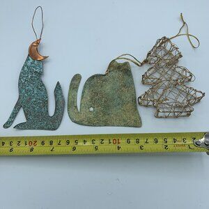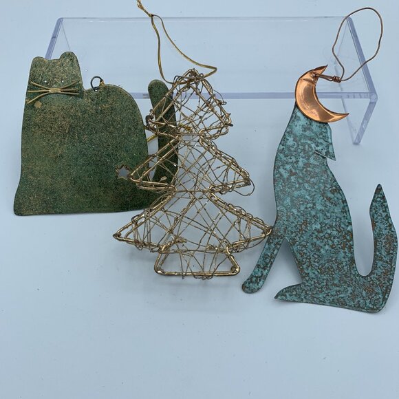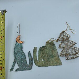 Set of 3 Rustic Metal Ornaments - Green Cat, Copper Moon Wolf, Gold Wire Tree