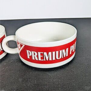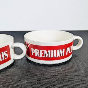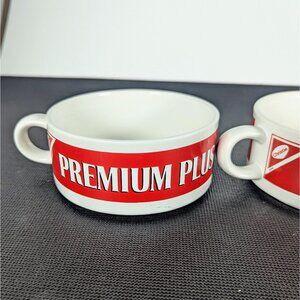 Elevate your dining experience with this set of three vintage Christie Premium Plus soup bowls, a genuine Nabisco collectible from the turn of the millennium. Crafted between 1990 and 1999, these round bowls are a testament to the timeless design and quality that ceramic & porcelain products are known for. Each bowl measures a comfortable medium size, perfect for serving hot beverages or soups, with a height of 2 inches and a width of 4.5 inches. The classic white and red color scheme lends a pop of vibrancy to any table setting, making these bowls suitable for all occasions. Although manufactured in China, the Christie Premium Plus model carries the distinct franchise charm of Nabisco, ensuring these are original pieces that would be a treasured addition to any collection or a delightful start to a new hobby of collecting vintage kitchenware.