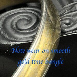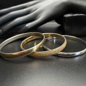 These are 3 vintage bangle bracelets together in a lot. Please note that they are not an original set - rather they are being all different pieces being sold together. There is 1 smooth gold & silver tone (MONET (c)) with some signs of wear. 1 smooth silver piece (Monet M) in great shape - note that this one is slightly thinner in width. 1 textured gold tone (MONET (c)) in great shape.