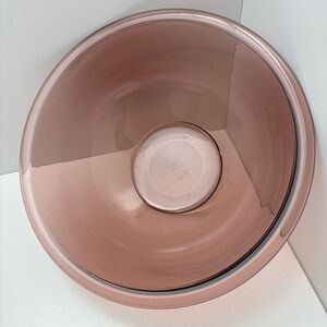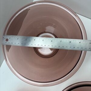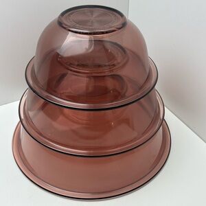 Set of 3 vintage Pyrex cranberry glass nesting bowls. Renowned for their durability and versatility, these glass bowls stand the test of time. In a lovely pinkish purple shade labeled as cranberry.