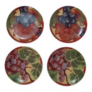 This vintage set of four BIA Vendange saucers with matching container is adorned with a grape leaf design by Liz Ross from 2003. Each piece adds a Tuscan touch to any table setting.