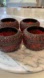 Set of 4 Handmade Classic elegant red glass mosaic with gold brass accent candle holders. Made in India. Comes with Tealights. Measures 3” high and 4” wide.