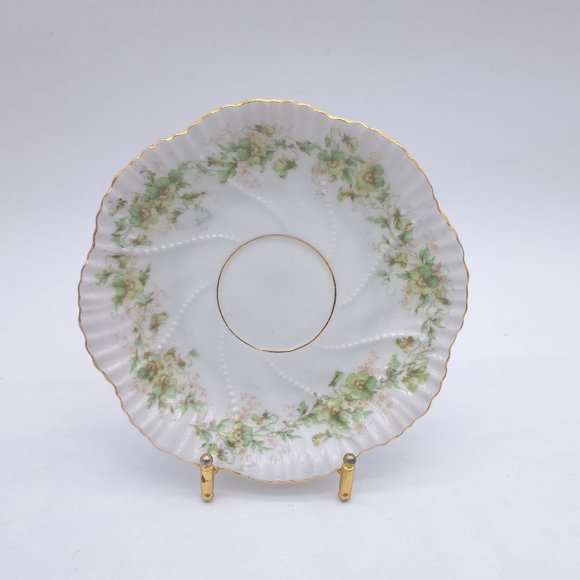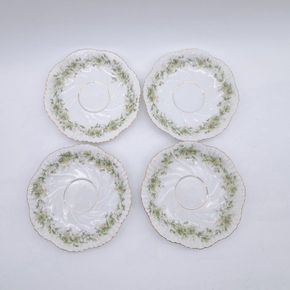 A set of 4 teacups and saucers made of a fine porcelain. They are decorated with green leaves with white flowers and gold trim. They are scalloped and the saucers are in a crocus shape and are ribbed with raised lines. I am unsure of the manufacturer as the only markings are 9206 77. They look German in the style of Hermann Ohme but could also be of French origin as they resemble some styles produced in Limoges. The saucers are 5 1/2" wide while the cups stand 2 1/2" tall with 3 1/2" mouths.