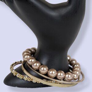 This listing includes 4 gold tone bracelets, 3 of which are fixed-size metal bangles, with the last being a beaded stretch bracelet. The metal bangles each have different details, but are all fairly thin and sturdy. The stretch bracelet is strung with gold-tone plastic faux pearls that are equal in size, shape, and lustre. The set has normal wear, but no issues affecting wearability. The pieces look great together but can also be worn alone.