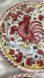 Set of 4 Italian hand painted ceramic salad/dessert plates decorated with a rooster pattern. I believe these plates are Deruta. Vibrant colours. If you look closely, you can see the brush strokes and also see that all four plates are slightly different due to hand painting. Each is marked with “A240” on the backs. Also on the backs of each piece there is a rough ring of orange/brown pottery which is not glazed.
