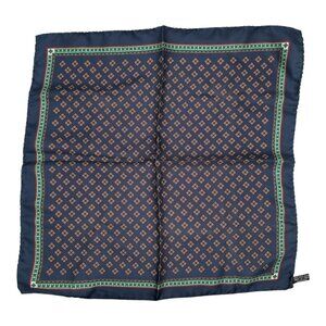 Set of 4 Italian Silk Pocket Squares. One purple with medallion print, one dark brown with greenish grey paisley squares, one pink with large middle print, and one navy with red and green diamond print. Materials: 100% silk. No known flaws.