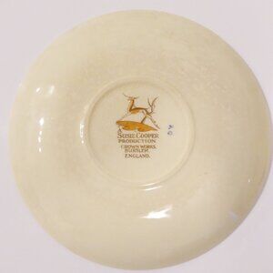 No chips or cracks, yellowing & some crazing throughout consistent with age. The printed mark for Susie Cooper Productions has her wonderful gazelle. The bowl measures 6-3/4 inches from tip to tip and 2-1/4 inches high. The liner (under plate) measures 6-1/2 inches in diameter. Please see pictures for full details.