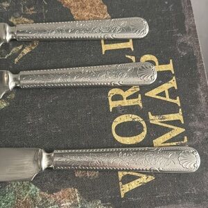 Elegant silver butter knives with intricate handle designs. Perfect for dining occasions.