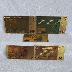 This Set of 5 Golden Foil Novelty Euro Banknotes (Not Legal Tender) are in the Fpllowing Dinominations of 5, 10, 50, 100, 200 $ Will Ship in Plastic Protection!!