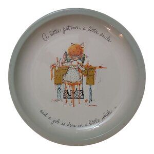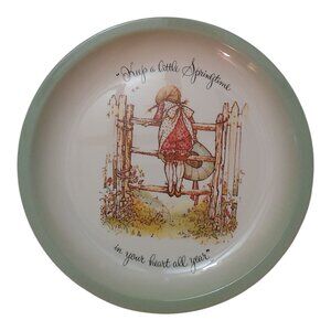 Relive the charm of the 1970s with this rare set of five Holly Hobbie Collector’s Plates. Made in the USA, each 6-inch plate features a unique picture of a girl or a girl and boy, paired with a heartwarming saying, framed by a light green rim with smooth edges. Weighing approximately 830 grams (1.8 lbs for the set), these plates are perfect as dessert plates, small appetizer servers, or collectible display pieces for Holly Hobbie enthusiasts and vintage decor lovers.