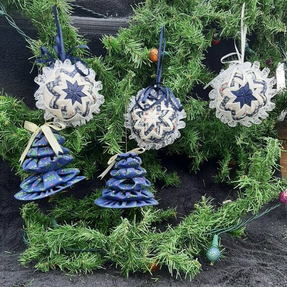 Set of 5 Vintage FOLDED STAR Hand Made Quilted Fabric Christmas Ornaments