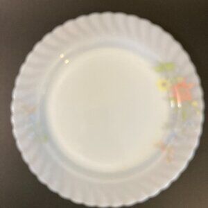Set of 5 vintage milk glass dinner plates with a delicate pastel floral design and scalloped edges. These lightweight plates have a soft translucent white base with colorful flowers in peach, yellow, and blue.