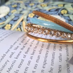 This set of five bracelets offers a delicate and sophisticated touch, blending the warmth of gold with the cool serenity of pale blue. Each bracelet, while distinct in design, complements the others to create a cohesive and stylish ensemble. Expect to find a variety of textures and details; perhaps a fine gold chain, paired with another adorned with small, pale blue beads. There might be a smooth gold band, alongside one featuring a light blue cord woven with metallic threads, and a final piece possibly showcasing a delicate charm, repeating the gold and blue theme. Together, these bracelets create a versatile stack that can be worn as a complete set for a bolder statement, or individually to add a subtle hint of colour and shine to any outfit. The pale blue hues evoke a sense of calmness and elegance, making this set perfect for both daytime chic and a touch of evening gl