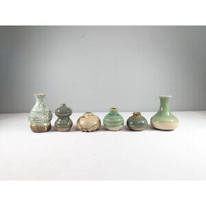 A small set of 6 handmade miniature potion bottles (wheel thrown, hand finished and hand glazed). Perfect as little vases, spice jars or simply sweet little pieces of home decor. This little lot is mostly in greens / browns / greys. All bottles have been glazed on the inside so they should fine to hold a liquid. Marked underneath YB (that´s me) - No stoppers (sorry!)