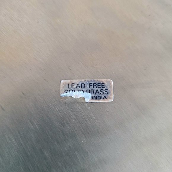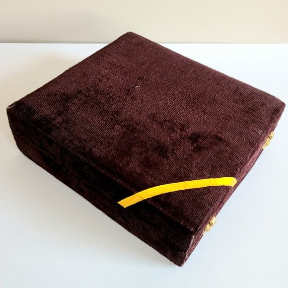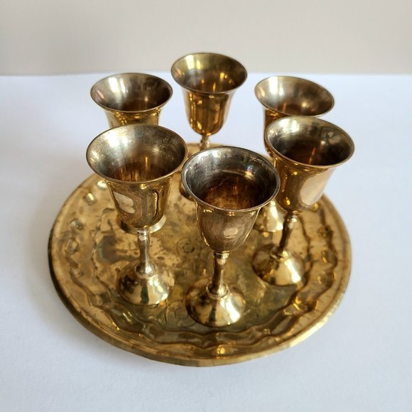 Set of 6 vintage brass goblets with tray in purple velvet box. Tray is 7'' wide and shows some patina. Goblets are 3.5'' tall. Box is 9'' x 8''. Good condition.