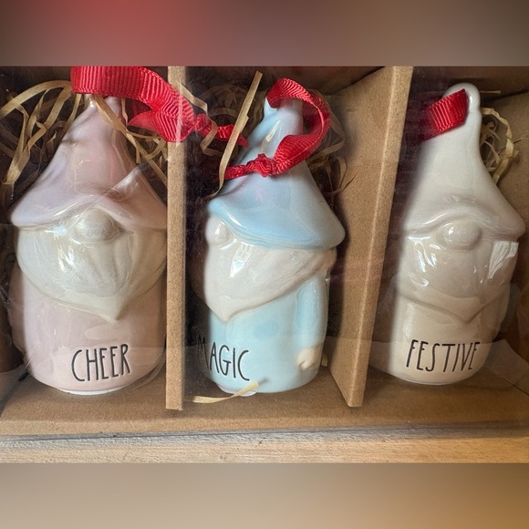 Set of Ceramic Rae Dunn Gnome Ornaments with Red Ribbons