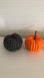 Charming set of four knitted pumpkins in gray, orange, cream, and light gray. Perfect for fall decor.