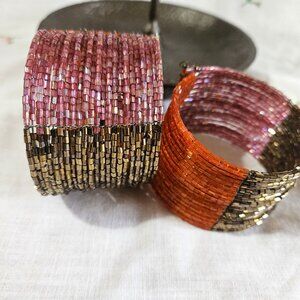 Set of 2 beaded cuff bracelets. iridescent pink, orange and brown beads on memory wire. Should fit most wrists.