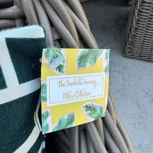 Two throw pillows, made with Sunbrella fabric. One lumbar pillow and one square pillow.