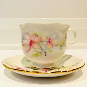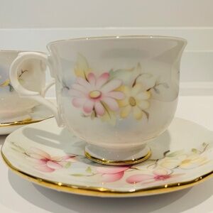 Set of Two Sadler Wellington Tea Cups. Delicate Pink and Cream Flower Decoration Gold Edging.
