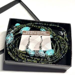 Set of beaded necklace and earrings - aqua, black and silver