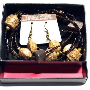 Charming set consisting of a multi layered necklace with various bead shapes and colors. In shade of tan, brown and golden tone. Matching hook earrings.