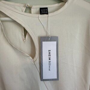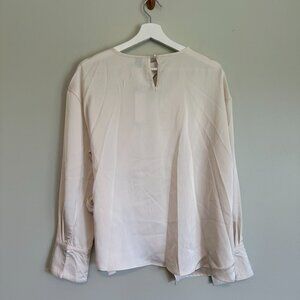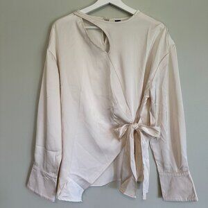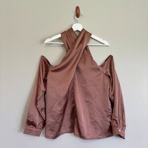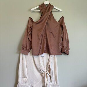 This set features 2 satin blouses in cream & brown. The cream colored blouse is high-necked with a small keyhole design and an adjustable faux wrap detail at the waist. The brown is long sleeved with an off shoulder design. Both blouses are beautiful and would make any outfit look elegant and upscale.