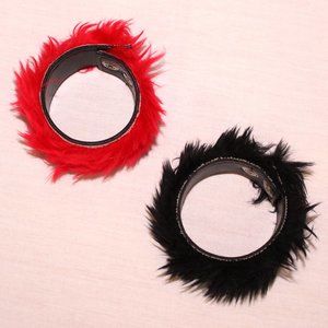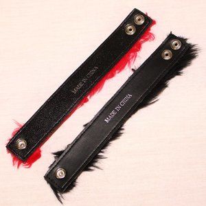 Set of two faux fur bracelet, one red and one black. Button closures. Never worn. Made in China. Bracelets are 7¾" long. Can be snapped around 7" biggest and 6½" smallest. Comes from a smoke-free home that has cats and dogs. Tags: punk, goth, y2k, alternative