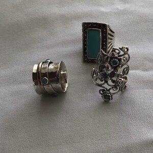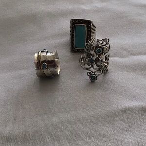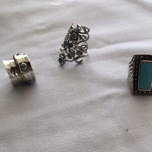Turquoise solver rings. Large square ring when on index finger is size 9, the one with Flores same size, the ring with 2 bands is size 7.
