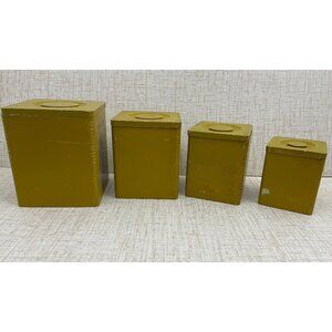 Stunning set of 4 1950s vintage wooden nesting canisters. Absolutely gorgeous green color, blue and black prints, the set do have visible wear that is consistent with age and gives a cute distressed look. The canisters are sturdy and they all have lids.