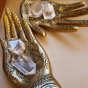These engraved hand dishes are an elegant way to store and display jewelry, trinkets and more. Made of resin and painted gold for an antique appearance, each hand is engraved with an intricate henna-like pattern to accentuate any necklace, bracelet or other jewelry and also make it easy to find.