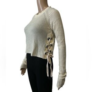 Cream-coloured knit cropped sweater. Features long sleeves and a side lace-up detail. Size small/medium.