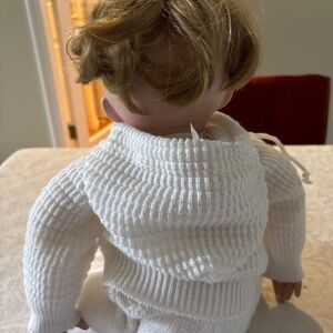 Doll is wearing a beautiful white sweater with attached hood and knit leggings.