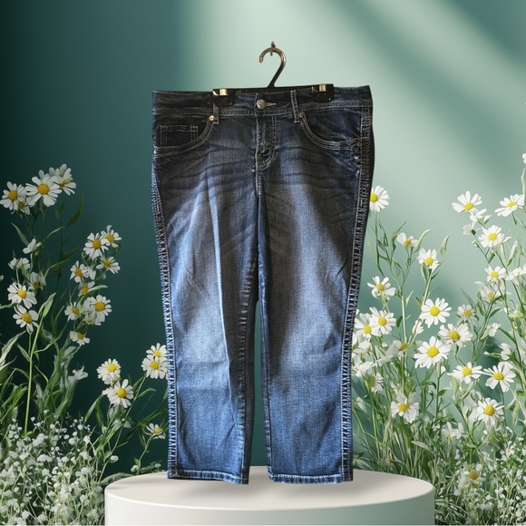 Seven7 Ladies Jean Capris. Size 12. Medium wash denim. Embroidered swirls on back pockets. Stylish and comfortable. Enjoy a classic fit with a modern touch.