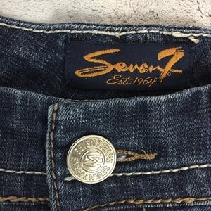 Seven7 Jean Shorts. Women's Tag Size 10. Measured waist 35. Cotton, polyester, spandex blend. Medium wash blue. Soft, lightweight. Finished Cuff. Mid Rise.