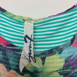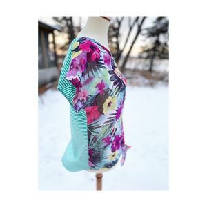 Short sleeves hang just off the shoulders. Sheer floral front with green and white stripes on the back (stretch fabric, not sheer). Knotted on middle lower hem. No rips, tears or stains. Pet and smoke free home. Material Sheer - 100% Polyester Contrast - 50 Cotton, 50 Modal Measurements Chest 23” flat lay Length front 23” Length back 26”