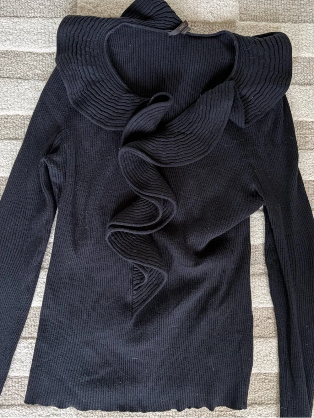 Elegant black ribbed sweater with a sculptural ruffled collar. Soft knit fabric for comfortable all-day wear. Versatile design pairs well with skirts or tailored pants. Easy-care style for a polished look.