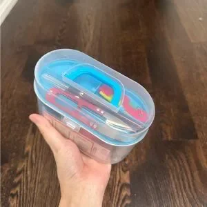 Keep your sewing essentials organized with this vibrant storage box. Featuring a pink handle and a clear body, it's perfect for easy access and visibility. Ideal for home storage and organization.