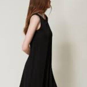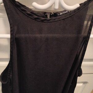 Zip back, and asymmetrical. Slightly sheer. Posted some images to try and demonstrate the look. Polyester. New condition.