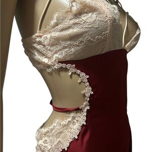 Gorgeous burgundy satin chemise. Features delicate blush-coloured lace detailing. Open back with tie. Side slits. Very feminine and flattering.