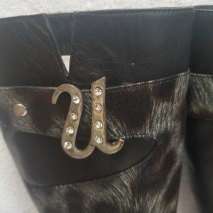 These unusual womens boots will turn heads for sure! All leather brushed nubuck leather in animal print black and grey. 4" heel, 19" height, 13" diameter at the calf, and a 1" platform. Hand made in Europe. Free shipping and heavily discounted,.