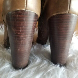 Stacked wood heel and ankle zip.