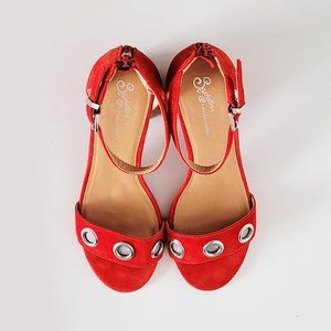 Gorgeous red suede leather sandals with grommets. Great used condition. Please see images for details. Very easy to walk in with the block heel.