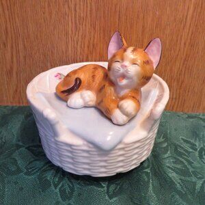 Vintage Seymour Mann one piece musical ceramic ginger cat in white basket,